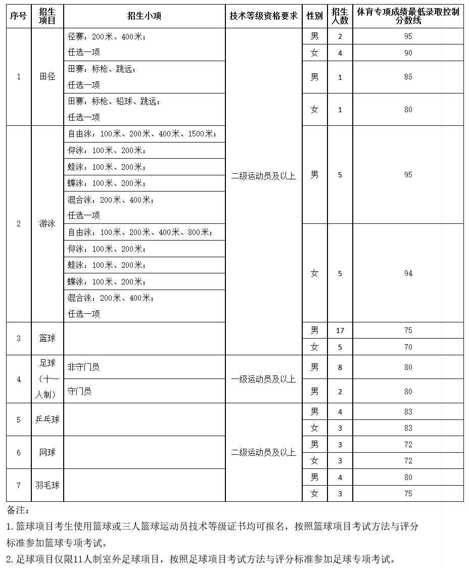我校招生项目包括:田径、游泳、篮球、足球(十一人制)、乒乓球、网球、羽毛球。全国招生(不含港、澳、台)计划总数为70人,具体如下。